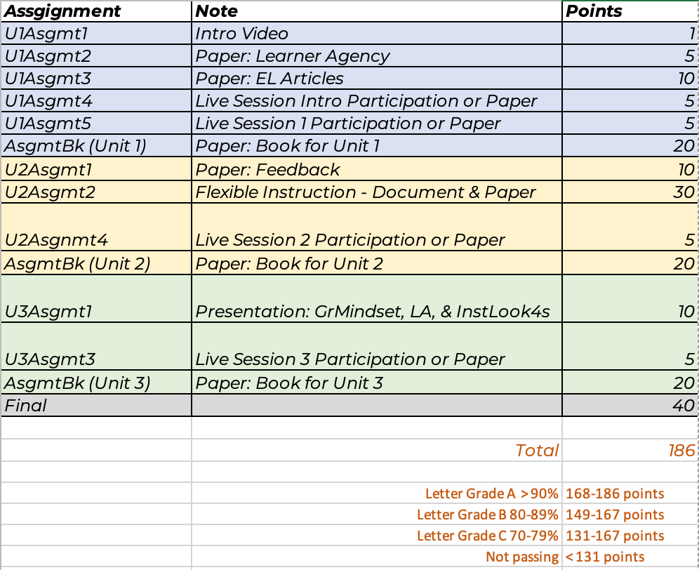 Late Work Policy: This course is self-paced with only a couple of assignments with hard deadlines. Everyone can re-do assignments—I would rather see mastery demonstrated by all, as opposed to sorting students via grades. My process is to give you feedback on your assignment by identifying my interpretation of your thinking. I often provide feedback withholding the grade for a few days/weeks as grades encourage people to work for the grade rather than for improved learning (there is a difference).